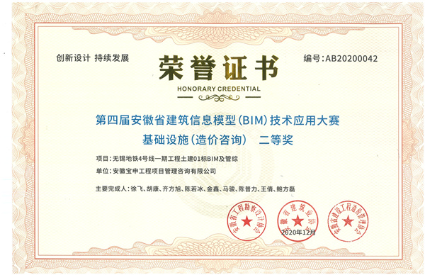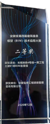 2020年12月安徽宝申工程项目管理咨询有限公司荣获第四届安徽省建筑信息模型(BIM)技术应用大赛基础设施(造价咨询)二等奖。