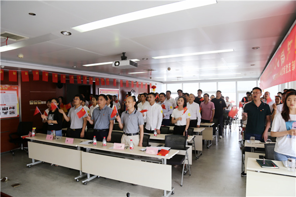 在“没有共产党就没有新中国”的激昂赞歌中,全体员工举起手中的党旗,同声高唱,颂党恩、听党话、跟党走。