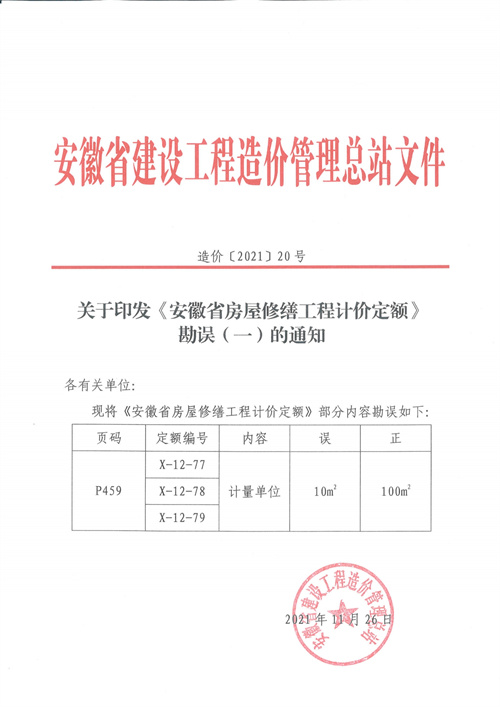 关于印发《安徽省房屋修缮工程计价定额》勘误(一)的通知