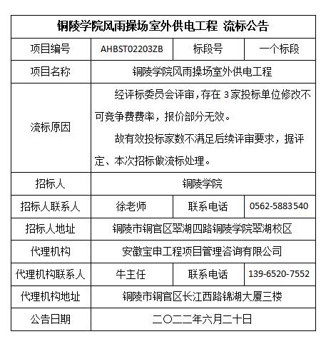 铜陵学院风雨操场室外供电工程 流标公告