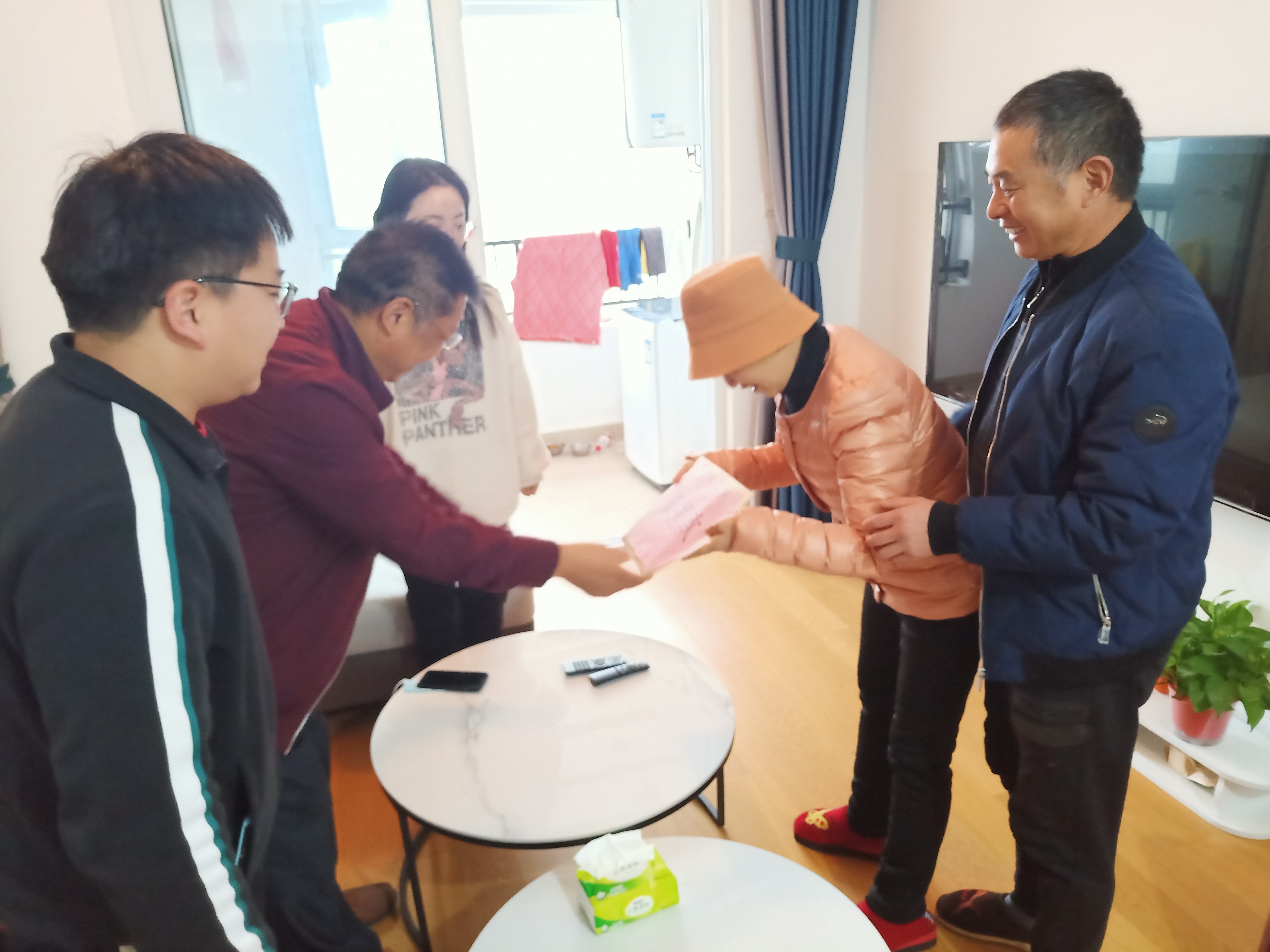 宝申职工陈双同志母亲罹患癌症多年,父亲年老体弱,家庭深陷困境。11月22日宝申党支部陈书记一行3人冒雨赶赴陈双同志家中慰问,将捐助的2万多元善款交到陈双母亲手中,并鼓励她坚强与病魔作斗争。