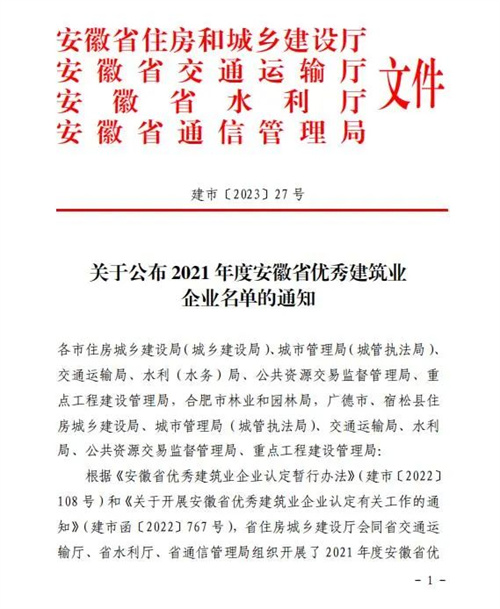 “安徽省优秀建筑业企业”荣誉的认定从企业社会责任履行、经营发展、管理创新、建造能力、文化建设等方面综合考评,旨在进一步发挥优秀建筑业企业引领带动作用,锻造和打响“安徽建造”品牌,推动建筑业高质量发展。