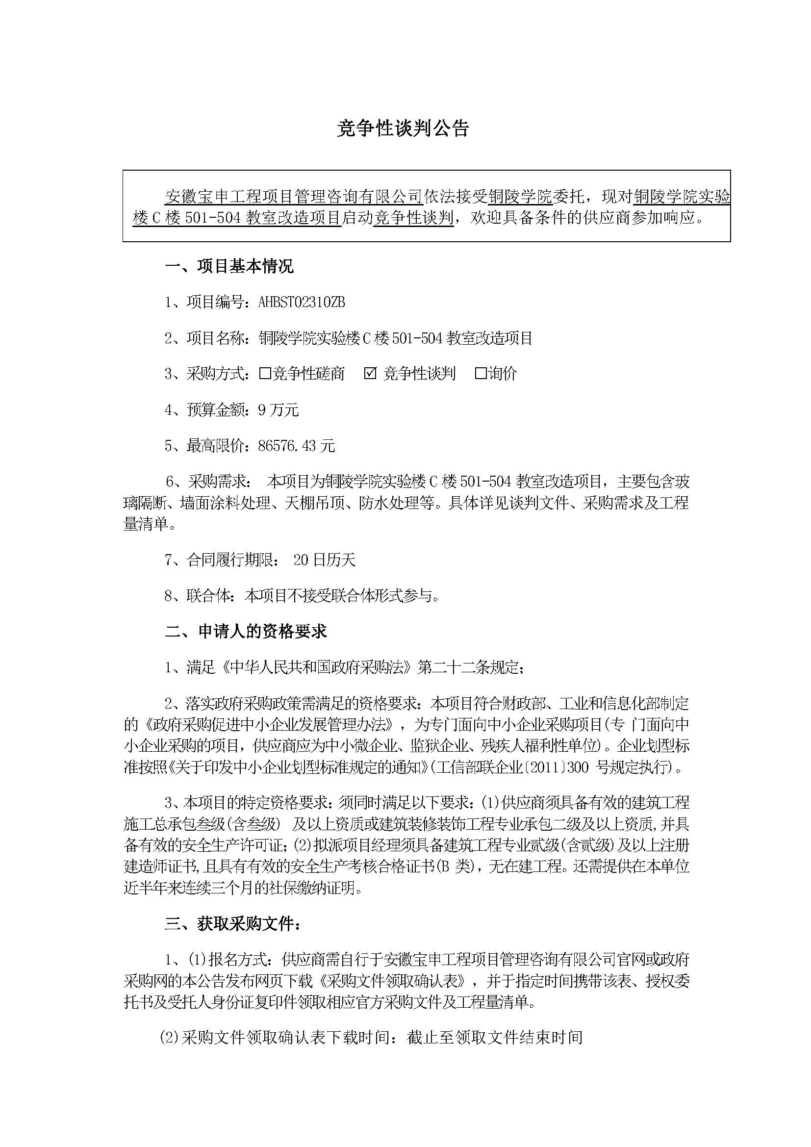 铜陵学院实验楼C楼501-504教室改造项目 竞争性谈判公告