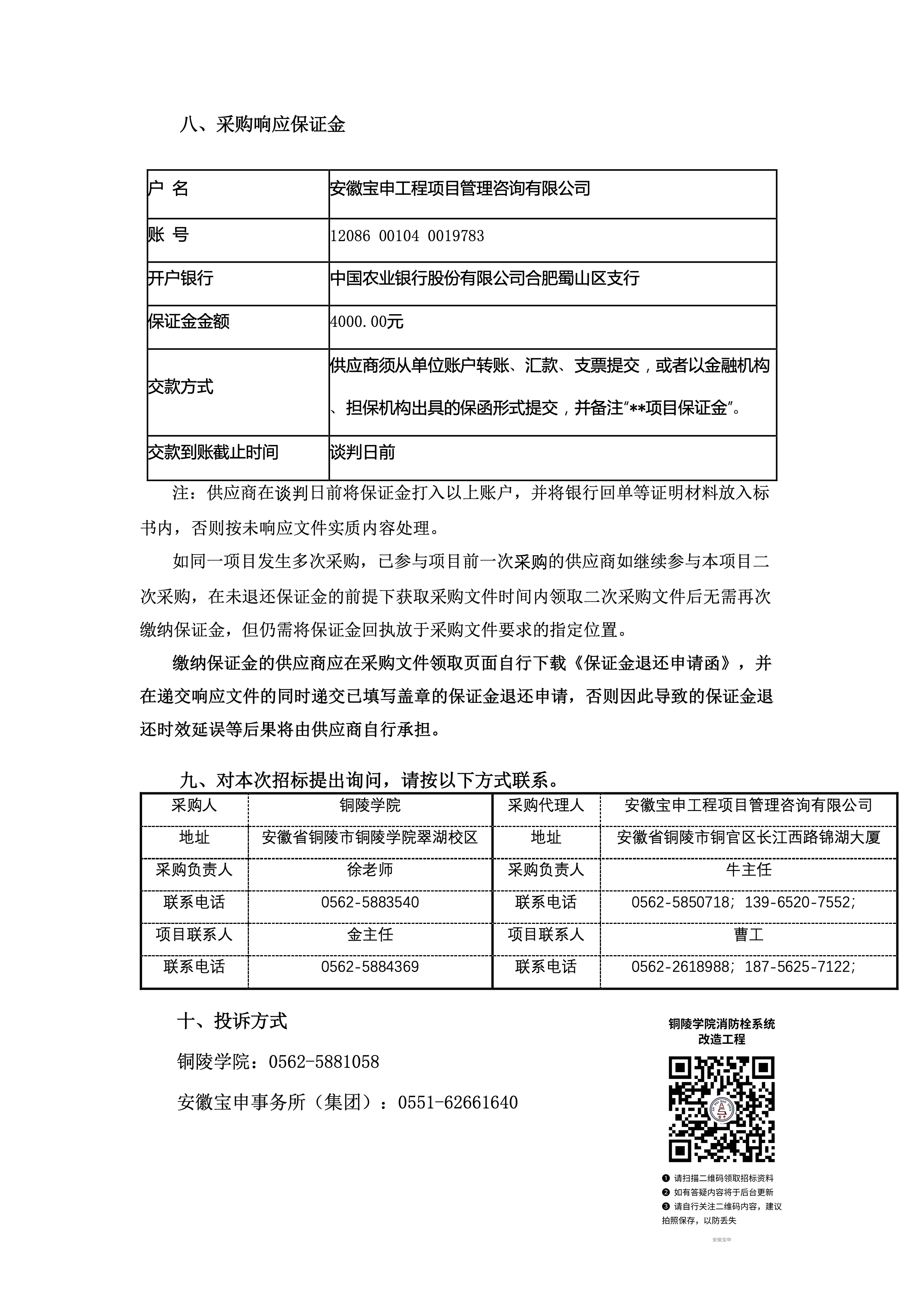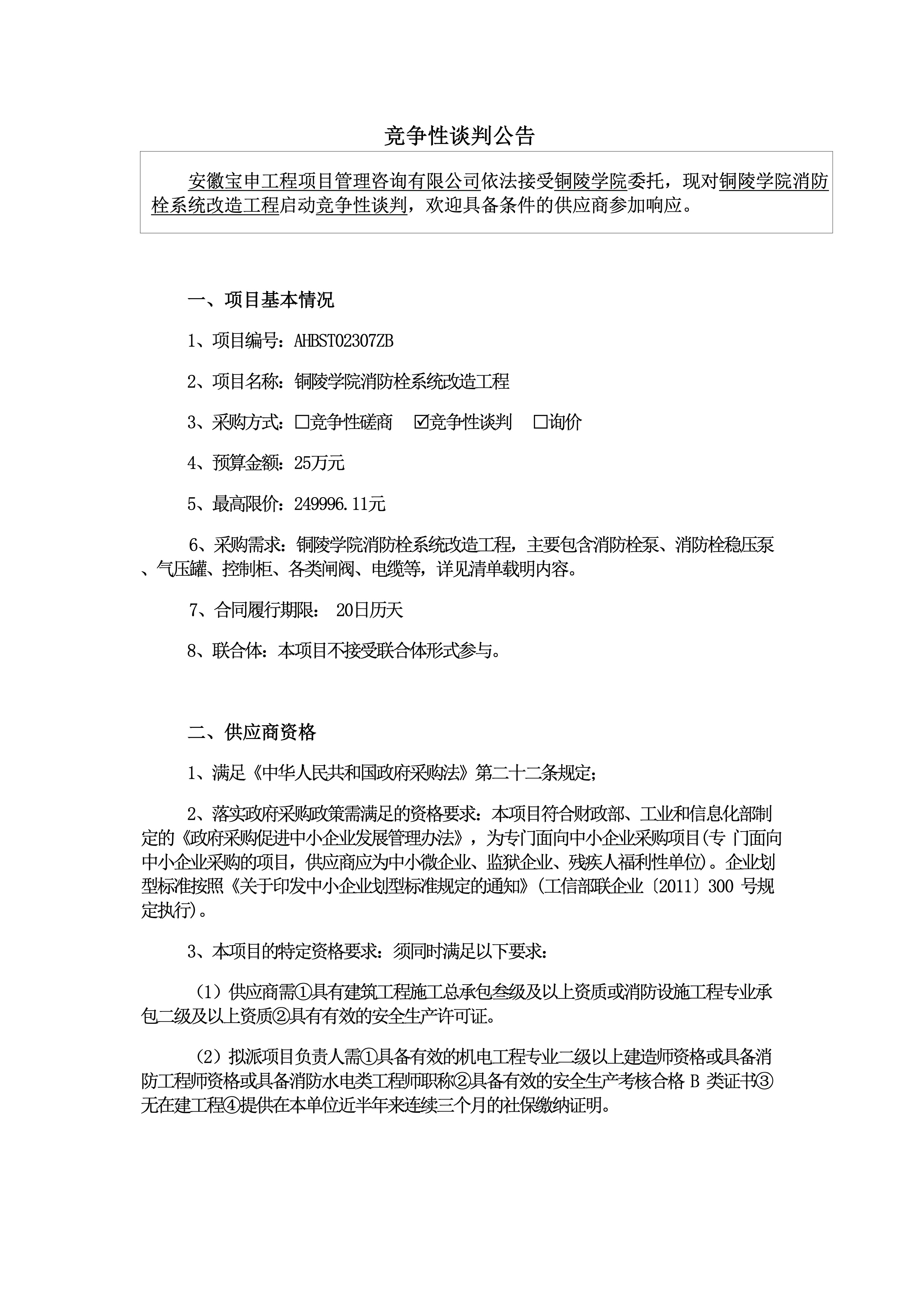 铜陵学院消防栓系统改造工程启动竞争性谈判公告