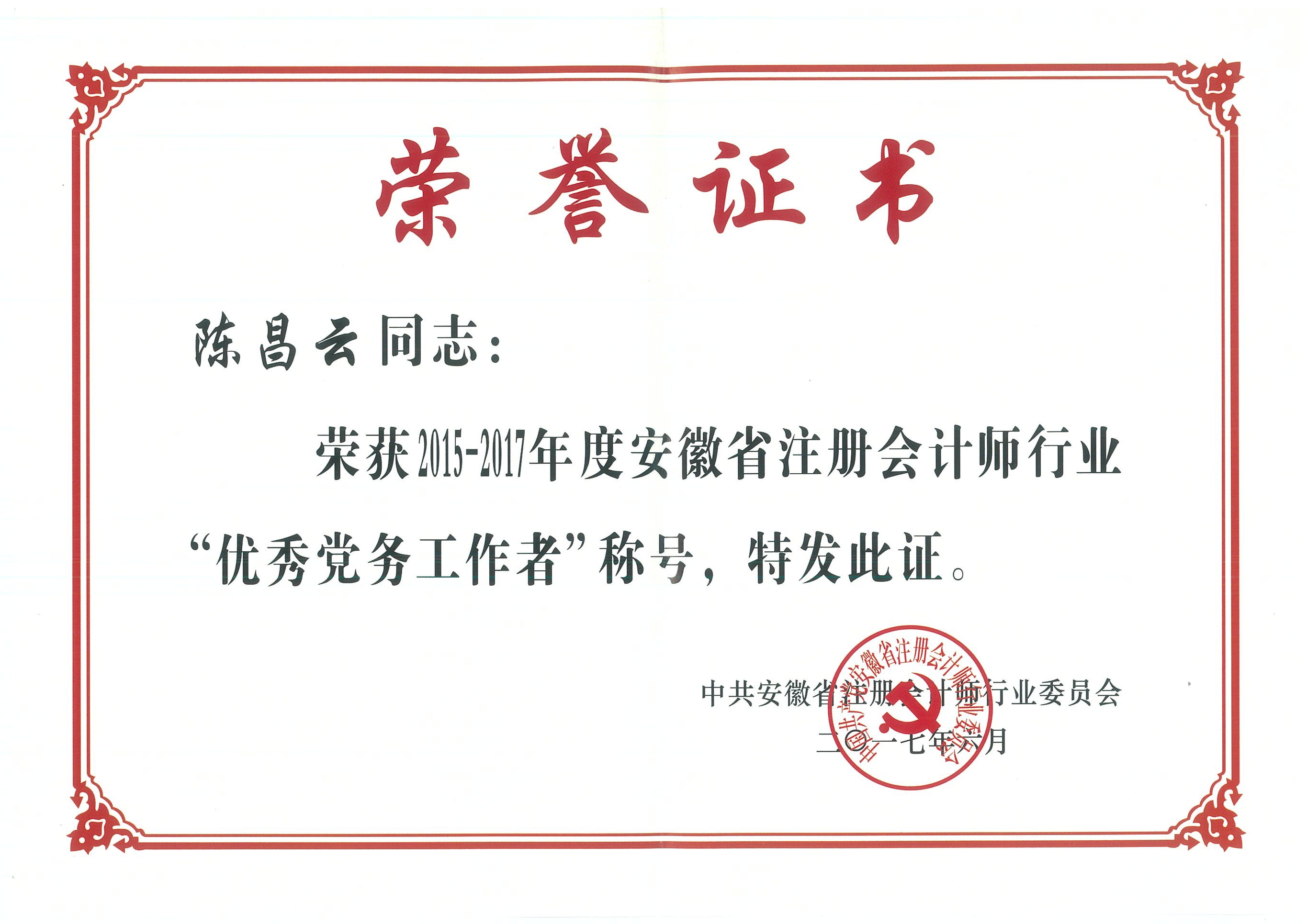 在2017年6月27日召开的全省注册会计师行业党建工作推进会上,安徽宝申会计师事务所党支部被安徽省注册会计师行业党委评为“2015-2017年度行业先进基层党组织”、支部书记陈昌云同志被评为“2015-2017年度安徽省注册会计师行业优秀党务工作者”,陈昌云同志在会上做了题为“聚精会神抓党建、凝心聚力促发展”的经验介绍发言。