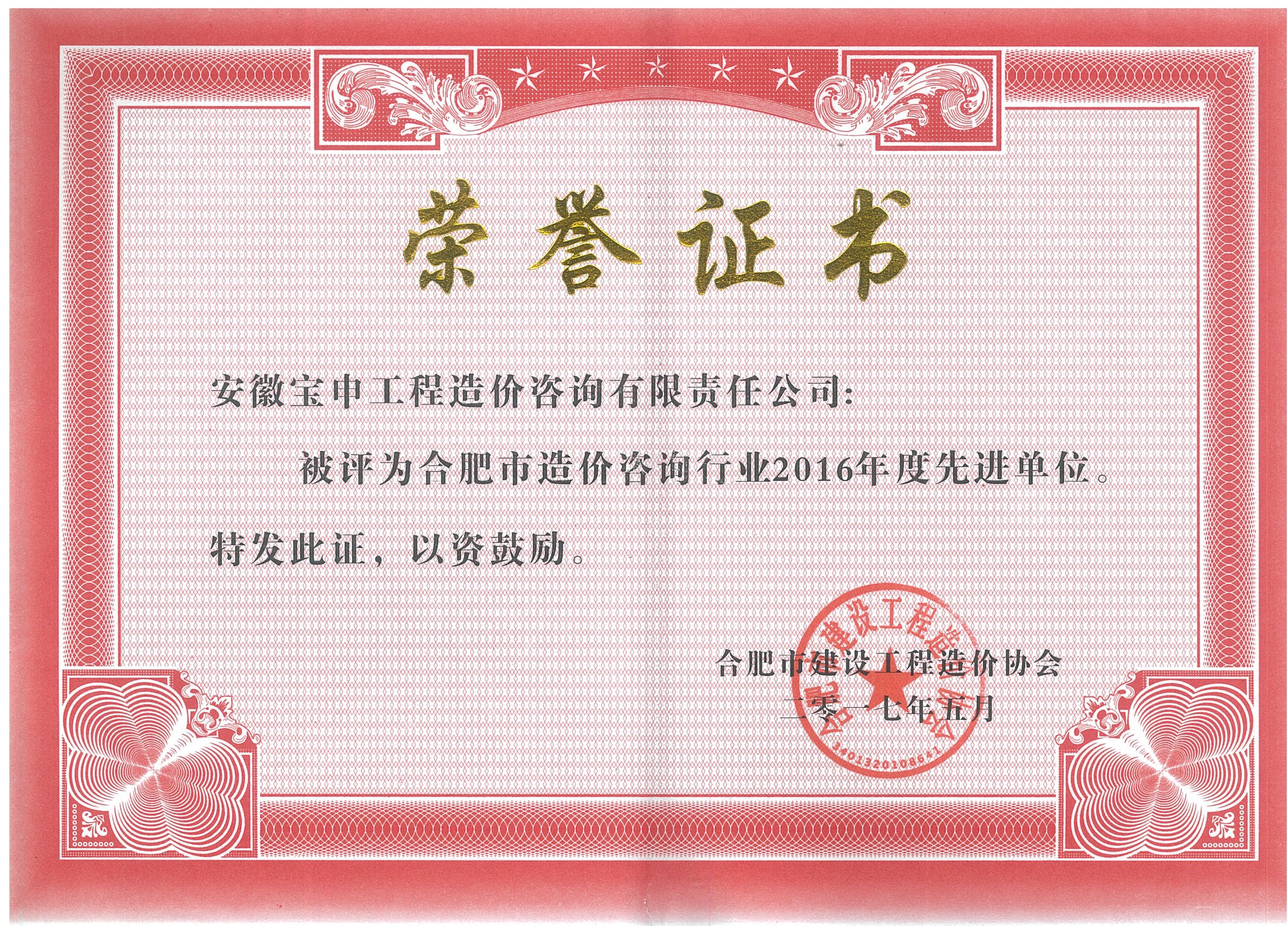 合肥市造价咨询行业2016年度先进单位--2017.05