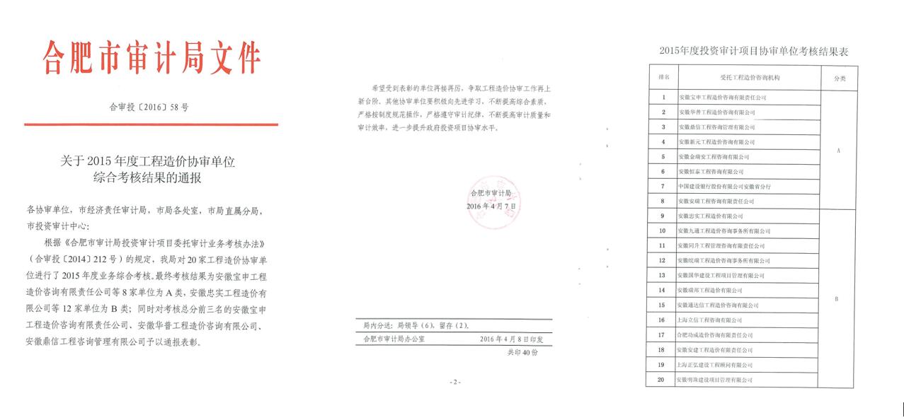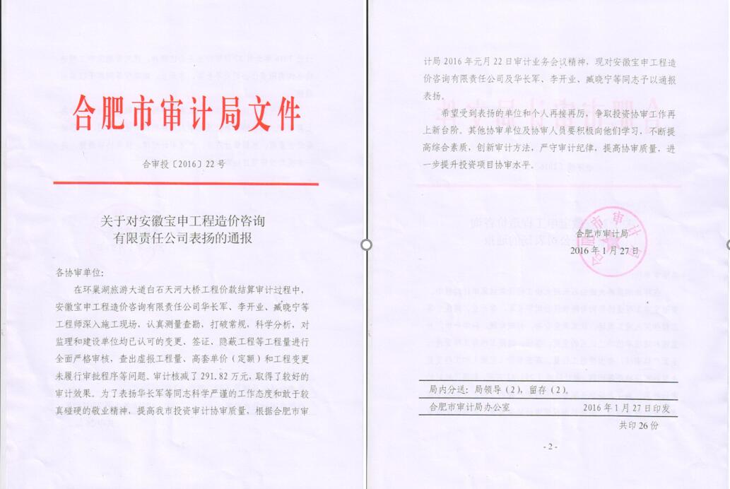 合肥市审计局对宝申公司及华长军等工程师的通报表扬--2016.01