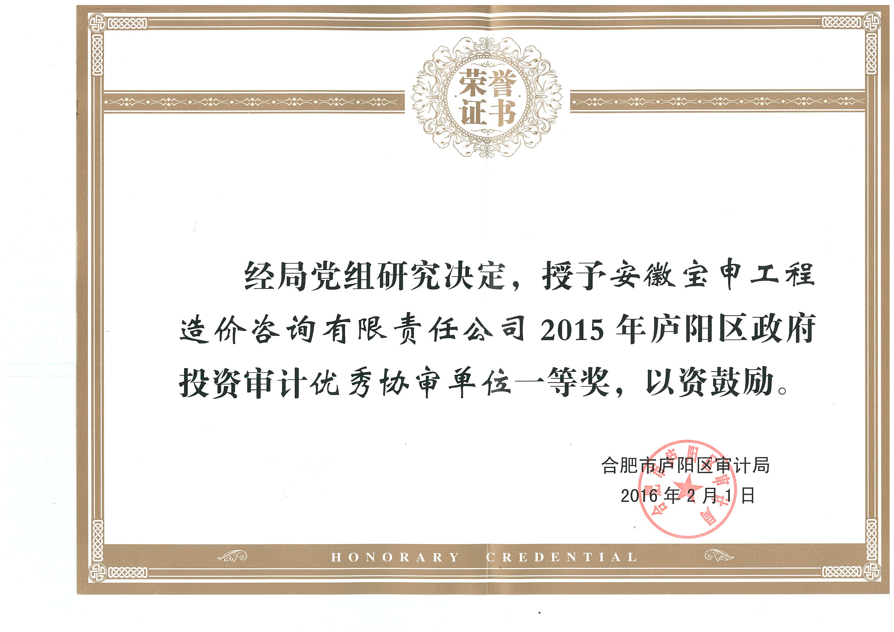 2015年庐阳区政府投资审计协审单位一等奖--2016.02