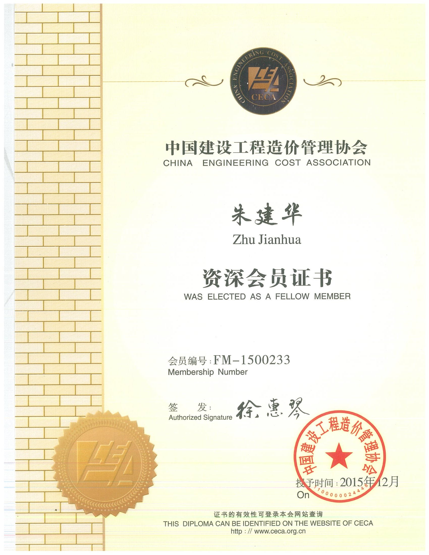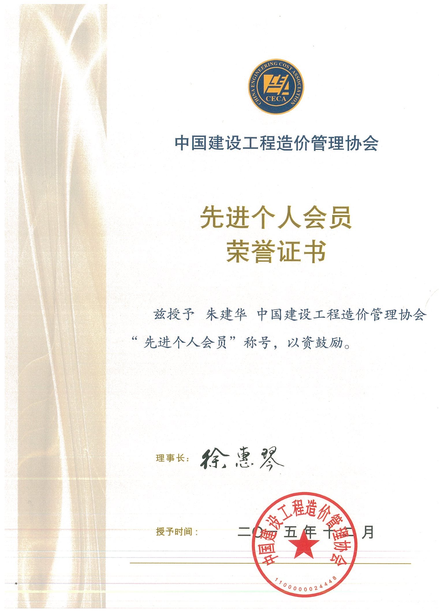 朱建华--中价协先进个人会员--2015.12
