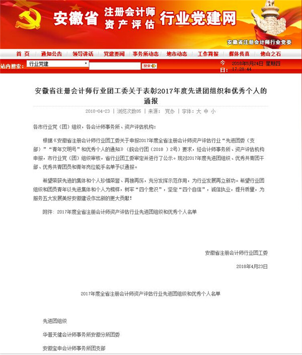 2017年度全省注册会计师资产评估行业先进团组织--2018.04