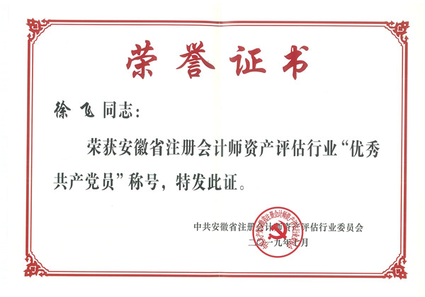 徐飞同志被评为安徽省注册会计师资产评估行业“优秀共产党员”--2019.07